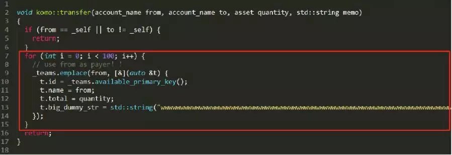 在例子中komo::transfer故意用账户from的授权写了很多无用的记录到stabe db,而这个操作用户在授权eosio::transfer时是不知情的。