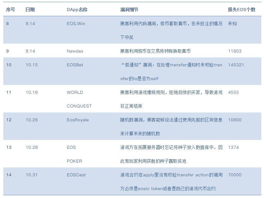 EOS DApp目前增长速度很快,数量超过了100个。EOS DApp安全问题主要包括以下几种类型: