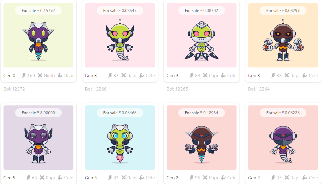 我们现在每120分钟发布一个新的,独特的“Gen 0”CryptoBot。“Gen 0”机器人的起始价格取决于售出的最后五个CryptoBots的平均价格加上50%。