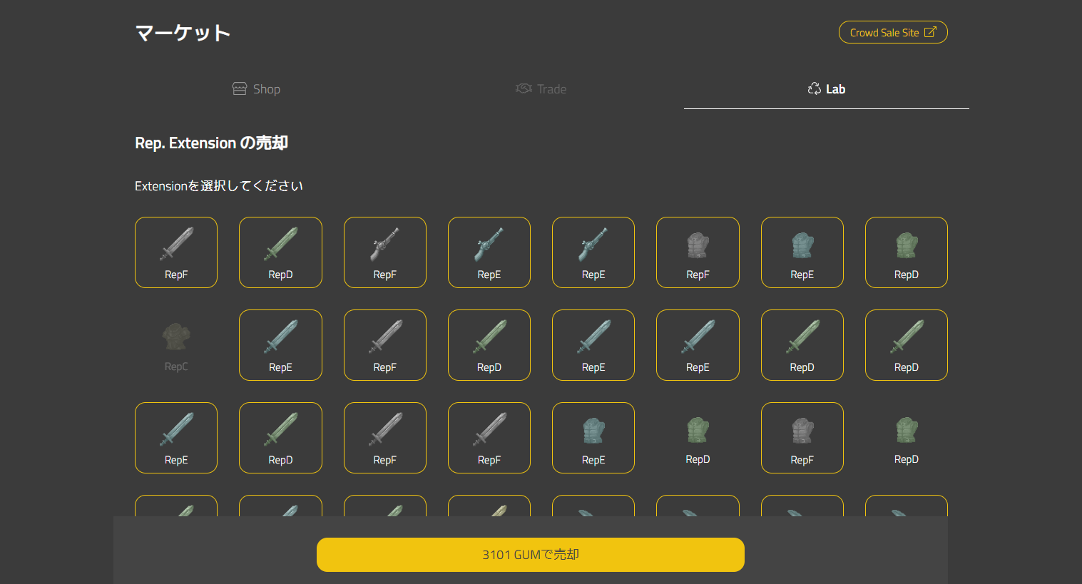 出售奖励物品时,需要先行点击之前图片所示的‘Rep.Extensionの売却’按钮。进入下个界面后,选择想要出售的奖励物品。确认选择无误之后,点击‘売却’,将奖励物品转换为GUM,即可完成出售。由于价格会根据市场的情况进行实时变化,需要玩家好好进行观察局势,使获得效益最大化。