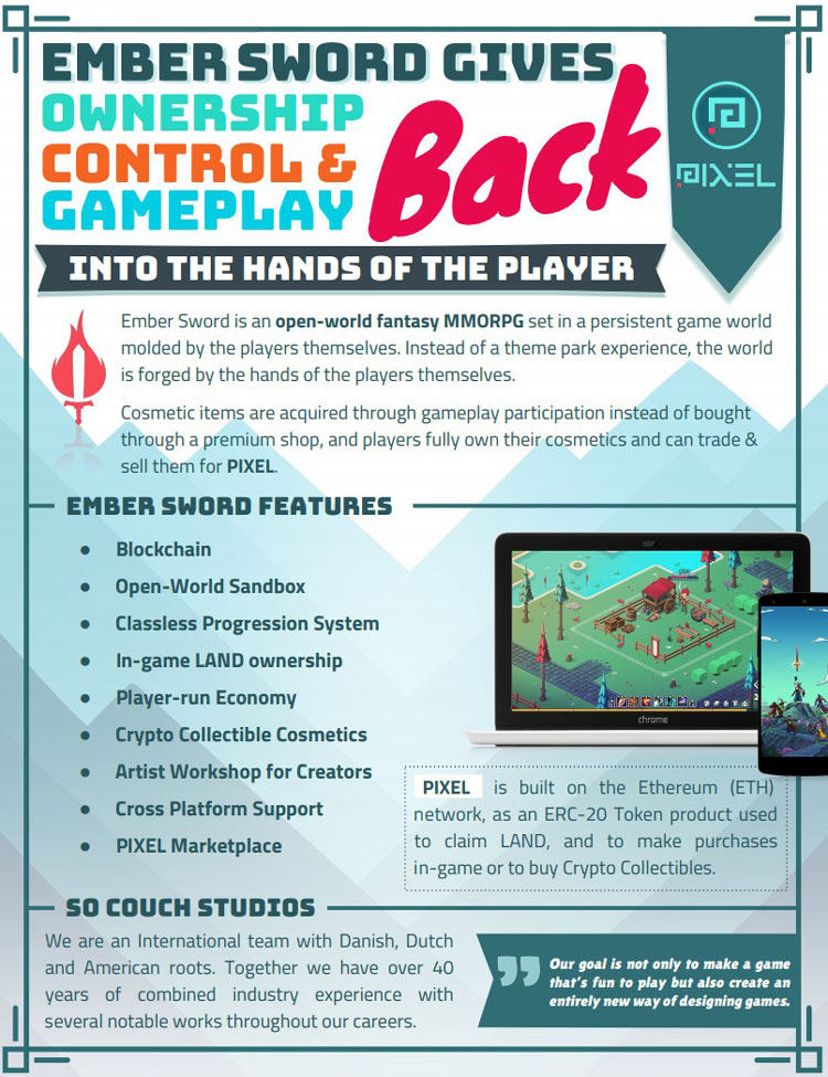 So Couch Studios是一家区块链增强型游戏的开发商和发行商,它使用标记化为玩家创造更好、更公平的游戏体验。该工作室目前正致力于他们的旗舰游戏——免费的多人扮演游戏《Ember Sword》。该团队拥有独立游戏和AAA级游戏的背景,如Guild Wars、Aquanox、Kaos Wars、Blitzkrieg、Tank Wars等等。整个团队成员是从游戏和区块链行业中精心挑选的,组成了一支无与伦比、值得信赖、技术精湛的国际开发团队。
