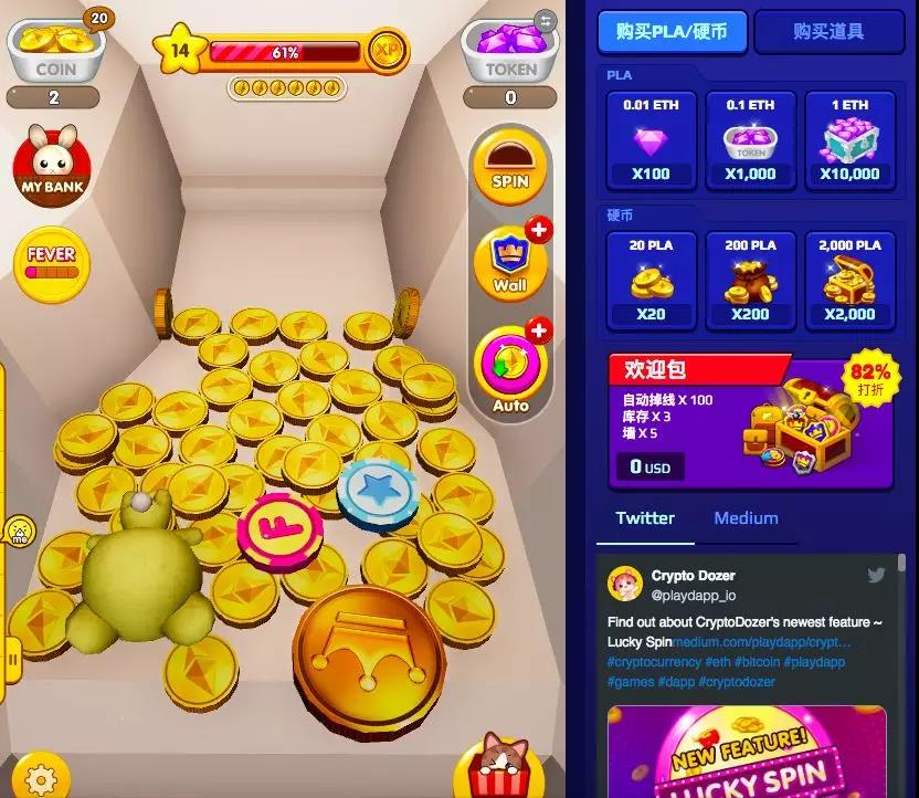 《Crypto Dozer》是PlayDapp团队推出的一款区块链推币机游戏。该游戏把线下电玩城的经典推币机游戏转移到了区块链上,并引进了代币经济机制。推币机的游戏方法相信去过电玩城的玩家应该都很熟悉:玩家们从机器后部投入游戏币,然后机器会向前推送,推挤使托盘上更多的的游戏币从前方的出口落下,从而达到以一博百的效果。游戏带有天然的以小博大的杠杆性质,一不小心可能会有点沉迷。