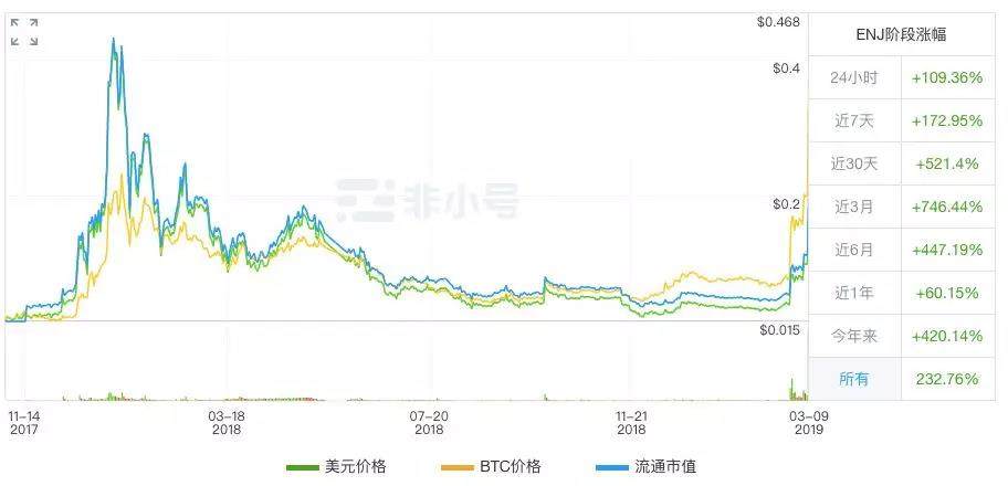 ENJ三个月暴涨746%,登顶区块链游戏流通市值首位!