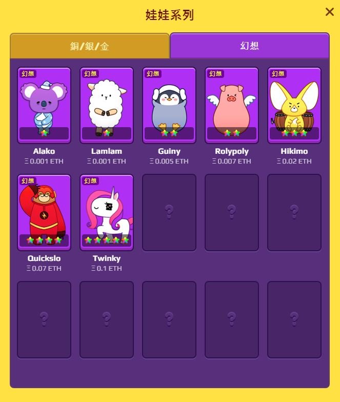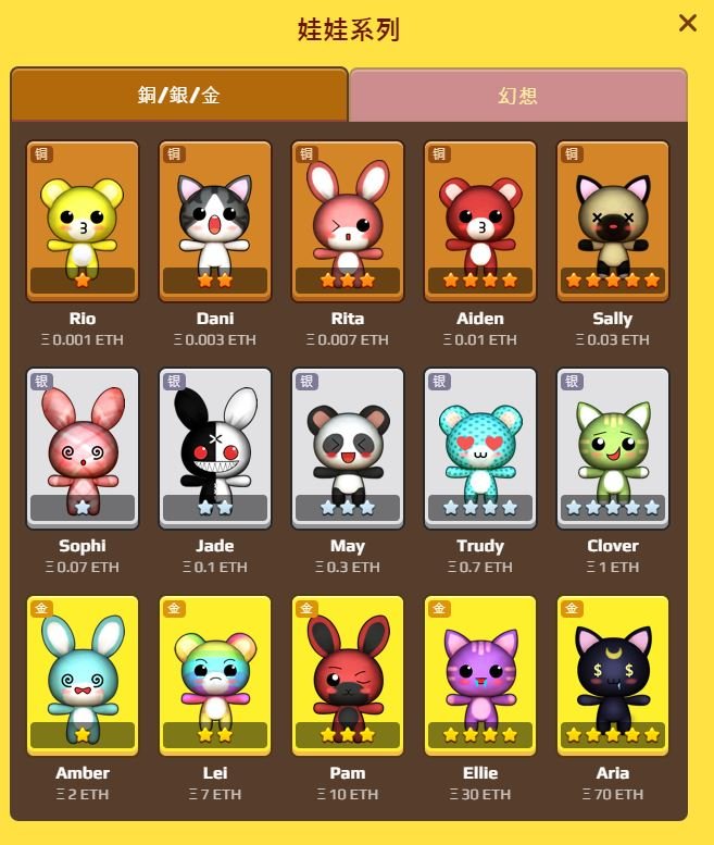 娃娃从0.001以太坊到几十以太坊,各有不同的价值,随机落在板上。