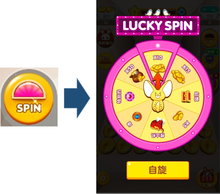 - 用在左右侧掉落的硬币,可充电自旋计。在自旋计充满时,可点击玩SPIN迷你游戏。