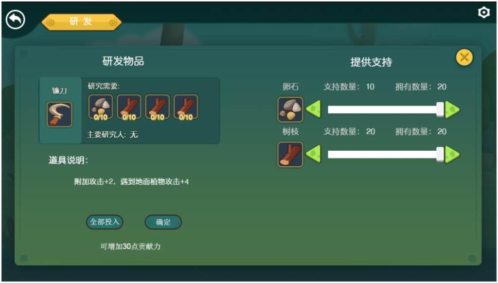 在这里投入正在研发的内容需要的材料,可以获得贡献值,当生产力达到一