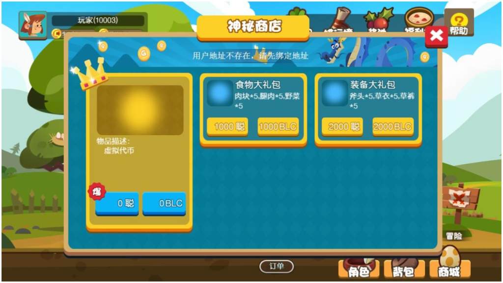 在商城内可以购买食物、装备礼包,在购买之前需要绑定钱包地址。