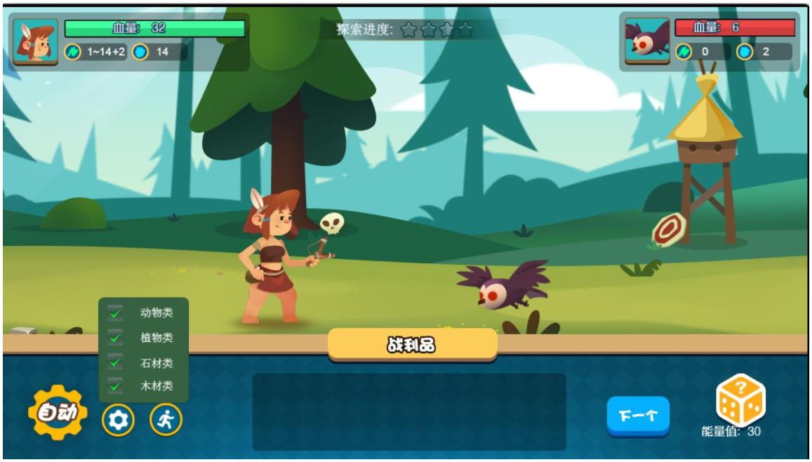 ②自动右侧的为逃跑按钮,点击后失去食物,获得战利品退出战斗。