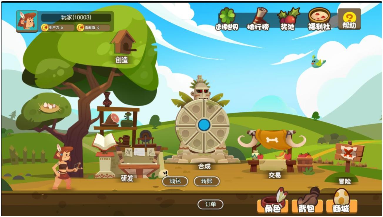 初始世界被定义为人类已诞生的原始世界时期,玩家进入游戏后,即扮演一个原始人角色,不断在游戏环境中获得生存资源,随着获取更多的资源,角色的生产力和整个世界的生产力都会不断提升,提升到一定程度后,整个世界就会解锁新的内容,进而获得更高的生产力。当世界新内容被全部开发完成后,就将开启新内容创作和对应的投票环节。在新内容创作后,玩家可汉用自己的 token 去支持自己认可的内容设计,获得最多支持的内容,将会优先进入游戏中。