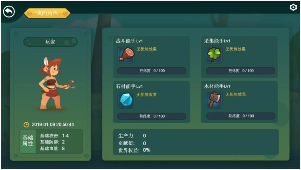 右侧为玩家的技能属性包括战斗、采集、石材、木材;