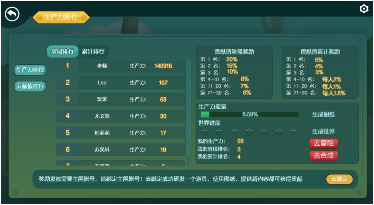 排行榜:分为生产力排行榜和贡献值排行榜,生产力排行榜可以看到新世界的开