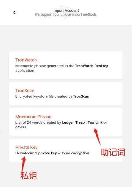 点击在Accounts栏目下方的“Import”,你可以导入你拥有的其他TRX钱包。用Private Key(私钥)或者Mnemonic Phrase(助记词)。