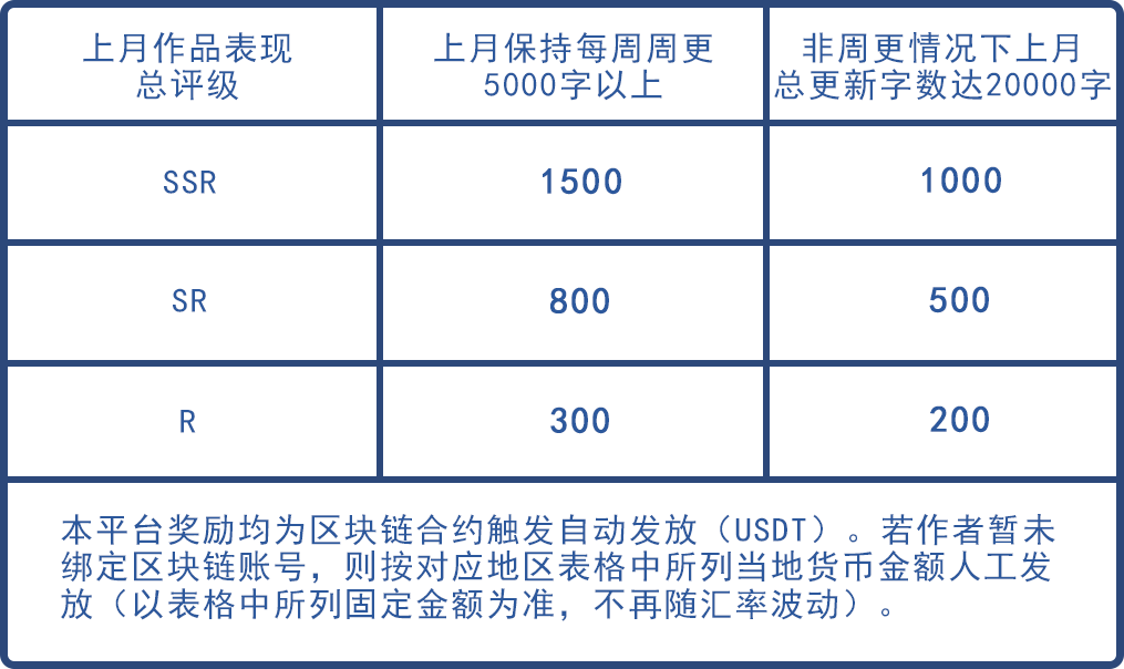 除去评级为N的作品,作者在上月保持每周周更5000字以上,或非周更情况下上月总更新字数达到20000字的,作者可根据上月作品表现总评级(一般来说,当有多个不同级作品时以更新字数更多的作品为准)获得以下相应数额的底薪收入: