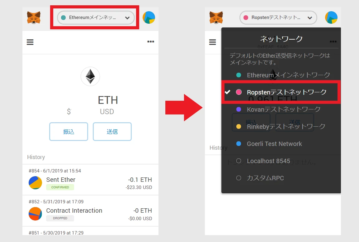 Start MetaMask and change the network by selecting the Ropsten test network in the network selection section above.