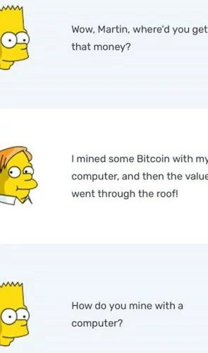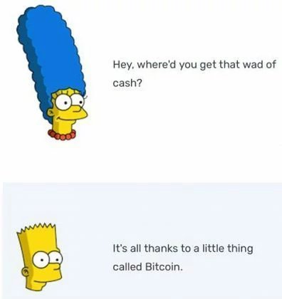 In 2013, Krusty answered Lisa’s inquiry on why he’s broke by saying “all it takes is bad luck at the ponies, worse luck in the bitcoin markets…”. In 2014, the sitcom’s bully, Jimbo Jones is advertising his bullying services and saying that he accepts bitcoin as payments.