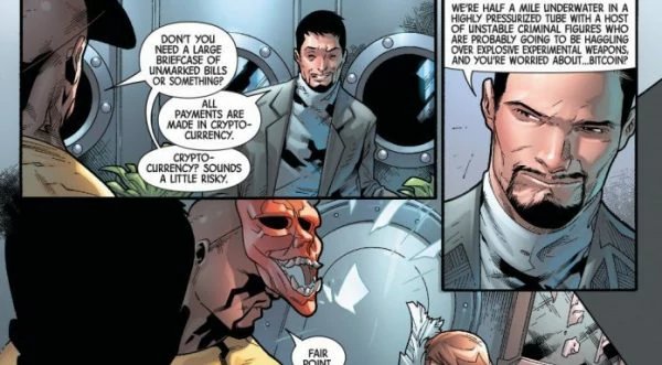 In this issue, without giving out too much, Tony Stark is having some dealings with the “typical” type of characters. In this case, he won’t use unmarked cash but will use cryptocurrency to seal the deal.