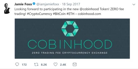 There are a few celebrities who started talking about blockchain years ago, but more are joining the revolution now. One of them is the Oscar-winning Jamie Foxx who used Twitter to endorse the ICO of Cobinhood, a ‘zero trading fee cryptocurrency exchange’. He has almost 5M followers, by the way!
