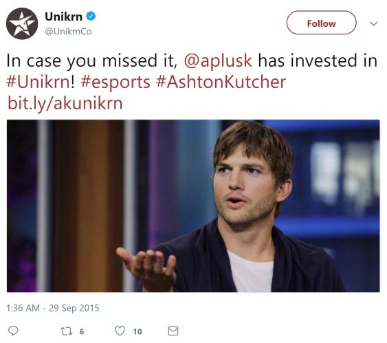 Hollywood actor Ashton Kutcher is a big tech investor. Kutcher is a longtime fan of blockchain technology (let’s just say he tweeted about Etheriumin 2014). He is an investor in the cryptocurrency exchange, BitBay, and his firm Sound Ventures is backing Unikrn, an eSports betting digital platform. Getting him onboard could be a huge success! Can you imagine, for how many people around the world he is a role model? At least, for 18M of his fans on Facebook, 2,5M followers on Instagram and 19M on Twitter!