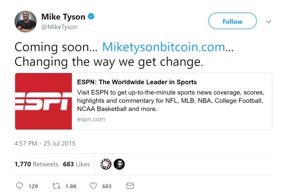 Boxing legend Mike Tysonpartnered with Bitcoin Direct to introduce Bitcoin ATM (which makes transactions “in less time than Tyson did a knock out’’) and a digital wallet for iOS and Android. When launching the ATM line, he said he was grateful to be part of the bitcoin revolution. That was in 2015, when Bitcoin was dirt cheap compared to the current price. We hope millions of Mike’s followers on social media took the hint and bought a few coins each!