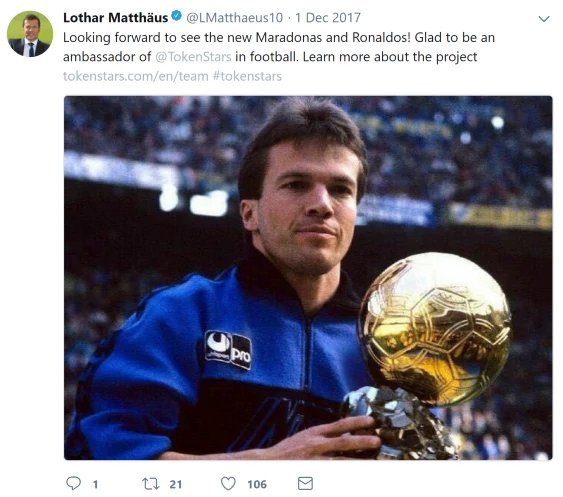 Lothar Matthaus, a football manager and one of the most successful German players of all time, played in 5 FIFA World Cups and led the West Germany team to victory in the 1990 World Cup. When TokenStars were looking to further enrich the expertise in talent management, we knew immediately that he was our man. Lothar Matthaus joined us as a Football Ambassador, because, as he stated, by decentralizing talent scouting TokenStars has a big potential to ensure that we’ll see the new maradonas and ronaldos in the nearest future.