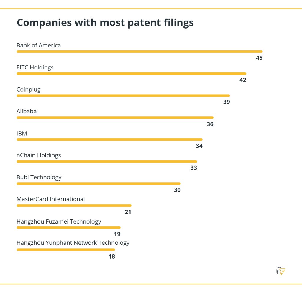 Somewhat similarly, Bank of America — another top patent applicant — seems to prioritize having a registered technology over actually using it. In 2016, Catherine Bessant, chief operations and technology officer at Bank of America, told CNBC that having blockchain-related patents is “very important[…] to reserve our spot even before we know what the commercial application might be.” Notably, Bank of America doesn’t appear to be positive about cryptocurrencies either. For instance, in May, the bank called Bitcoin ‘troubling’ and uplifted its decision to ban customers from purchasing crypto.
