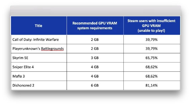 Every year the game industry requires more powerful hardware which, due to the high prices, is not available for all gamers. Monthly Steam researchproves that top new products often require hardware specs higher than what most can afford to have: