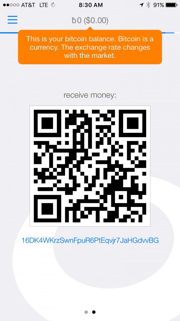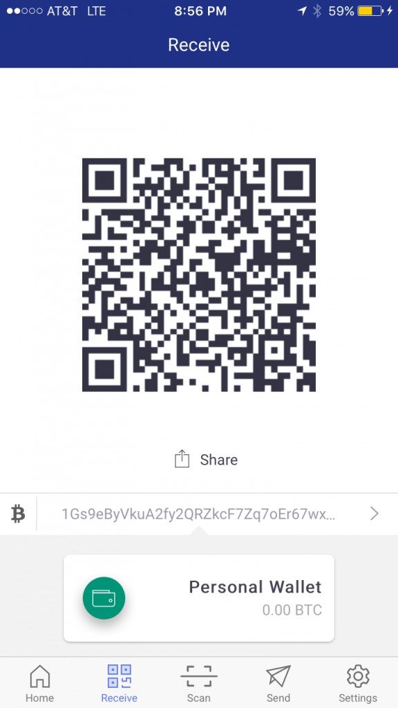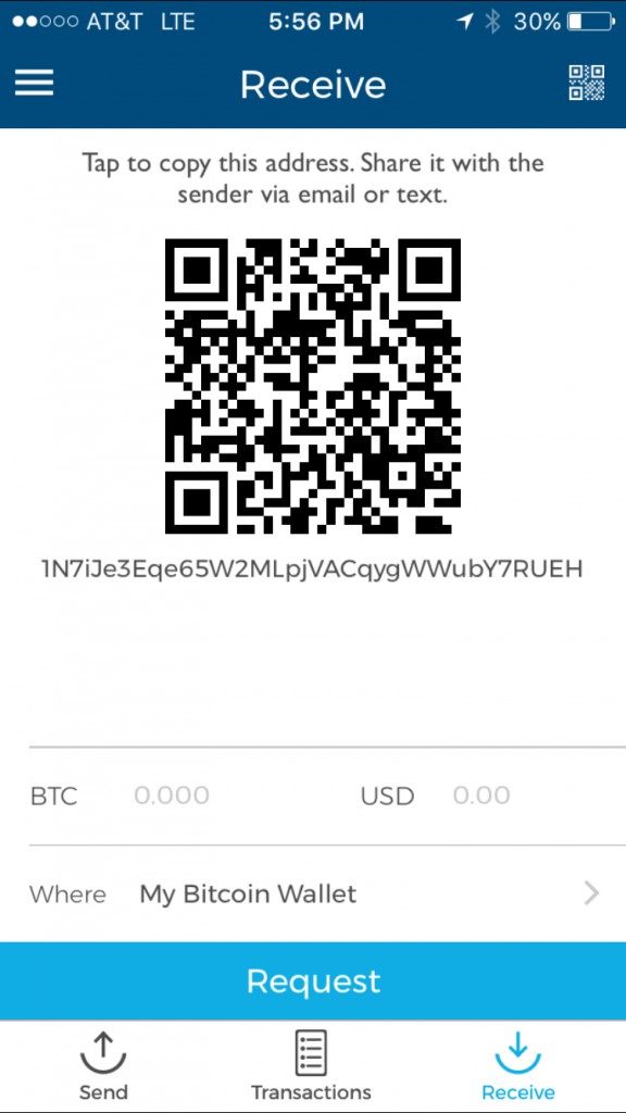 To receive a payment, swipe right or tap on “Receive” in the bottom right hand corner of your screen and Blockchain will take you the Receive screen like the one pictured below: