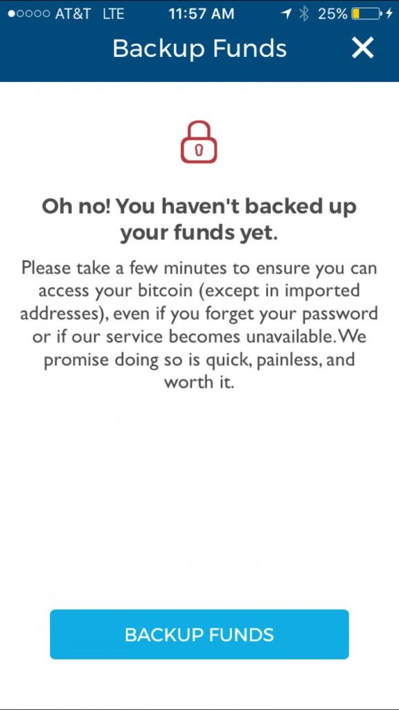The following “You haven’t backed up your funds yet screen will be displayed. Tap the “BACKUP FUNDS” button.