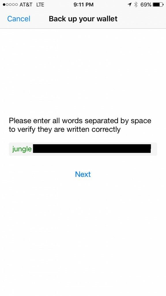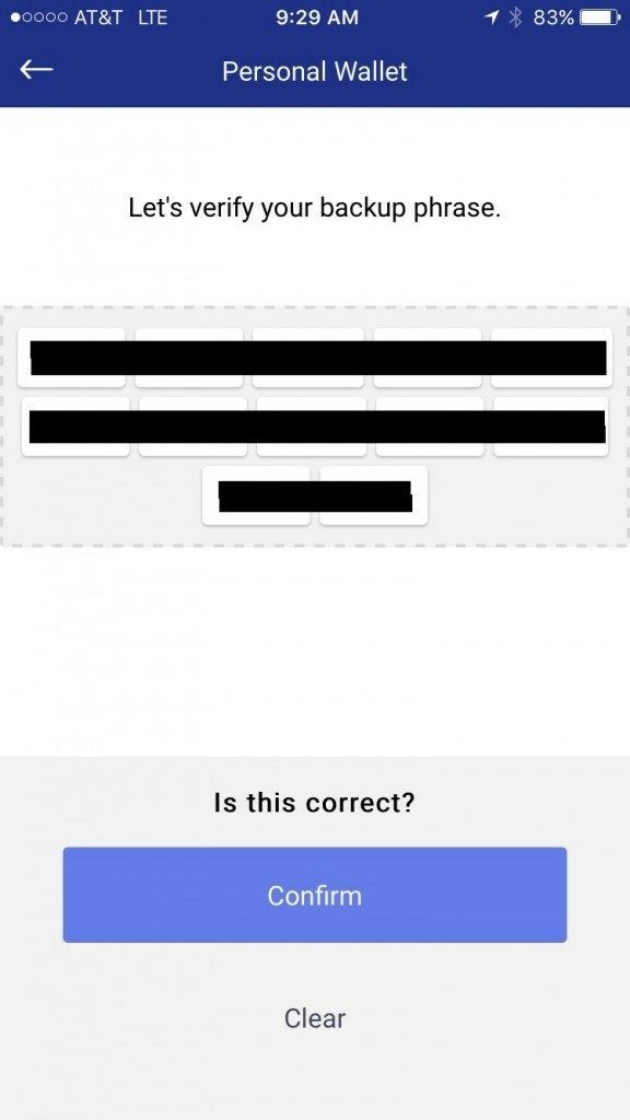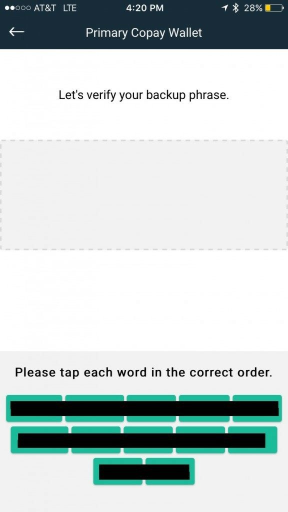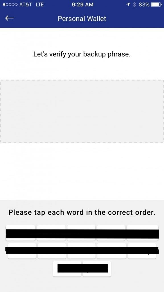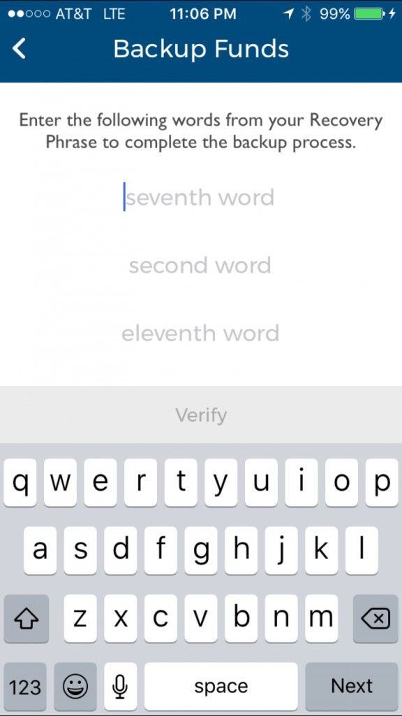 After you complete writing down this 12 word phrase you will be asked to enter in 3 of those words to verify that you actually wrote them down. Enter the requested 3 words into the appropriate field and tap verify.