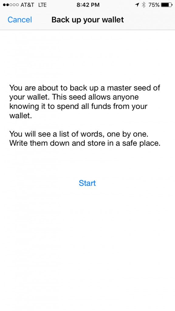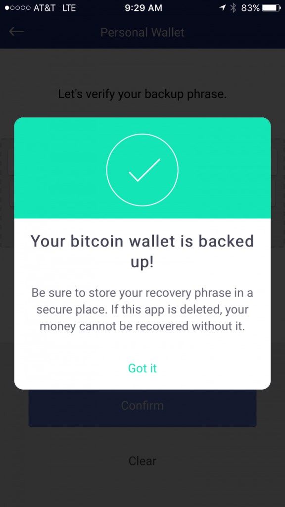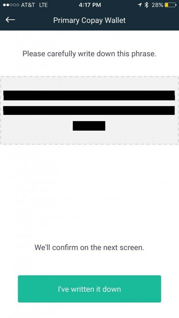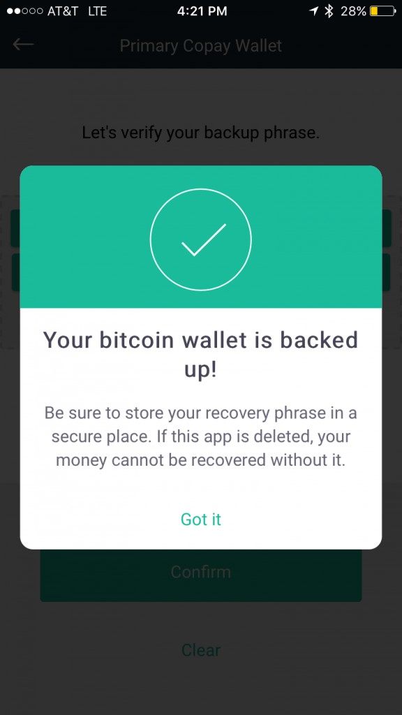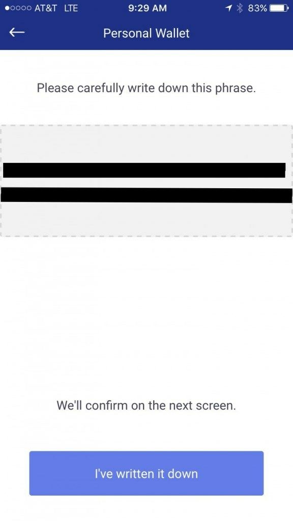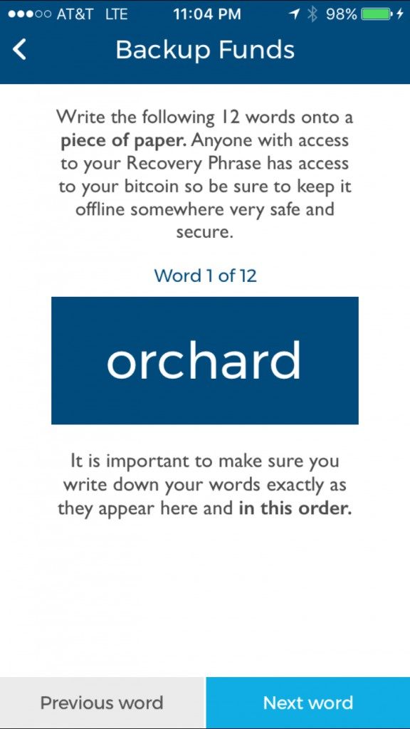 After you complete writing down this 12 word phrase you will be asked to enter in 3 of those words to verify that you actually wrote them down. Enter the requested 3 words into the appropriate field and tap verify.
