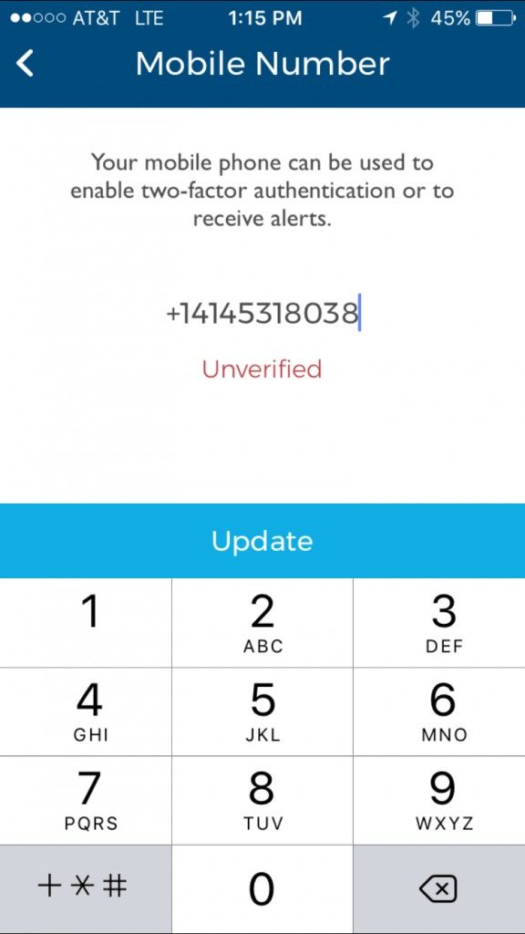 Go ahead and enter you mobile number into the corresponding field as shown above. Then tap the blue “Update” button above the numeric pad.