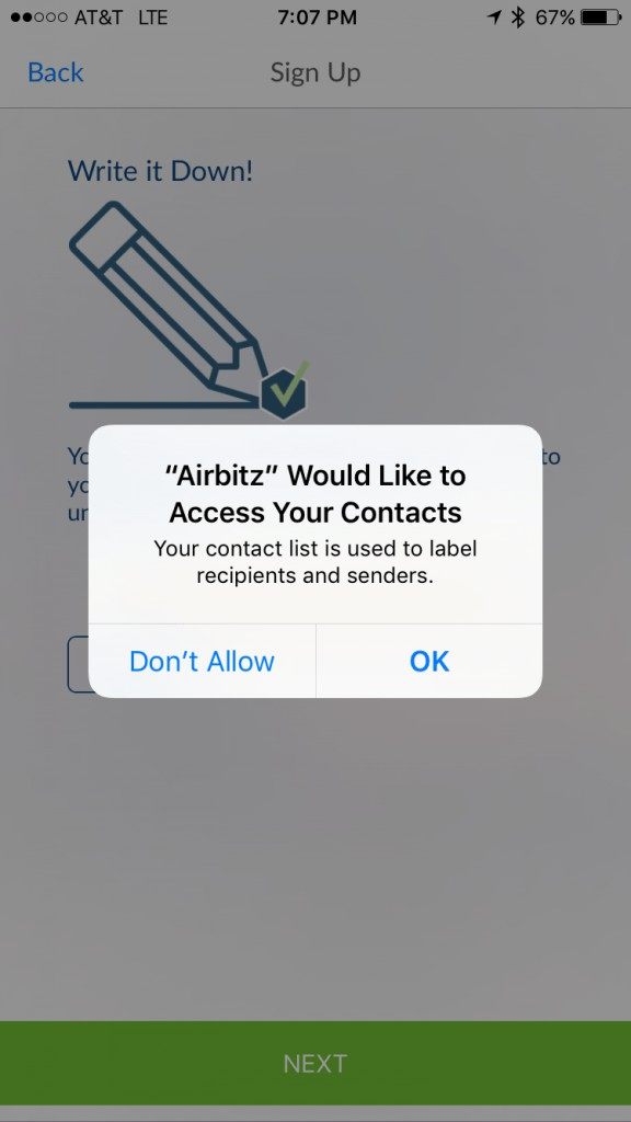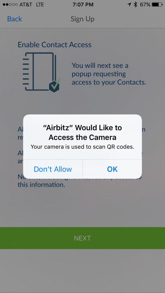 Next, you are presented with a pop up window requesting access to your Camera. Airbitz needs this to scan QR codes to pay people and merchants.