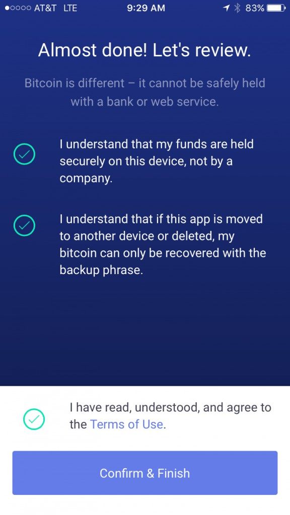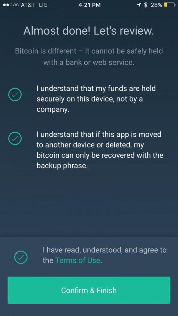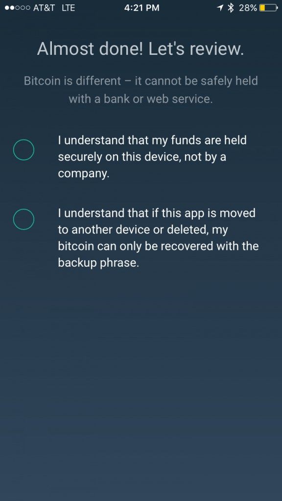 Clear instructions about these requirements are included on the page, and Airbitz won’t allow you to set a password that doesn’t fit into these parameters.