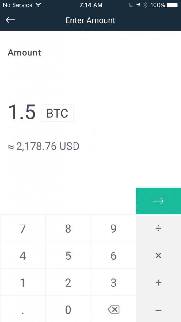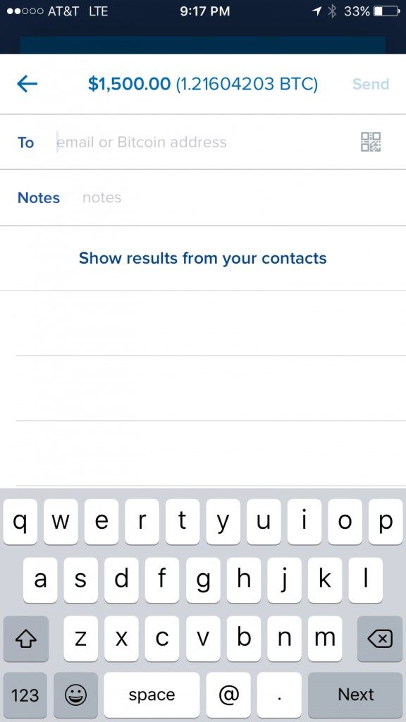 Next, enter the wallet address you wish to send bitcoin to in the “ To” “Enter Bitcoin address or select” field, and the the amount of bitcoins you want to send in the BTC or USD field and the current market value will display. Tap the “Send” at the bottom of the screen to send payment…
