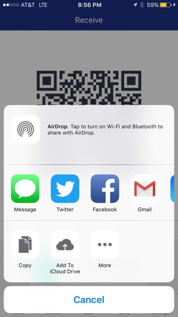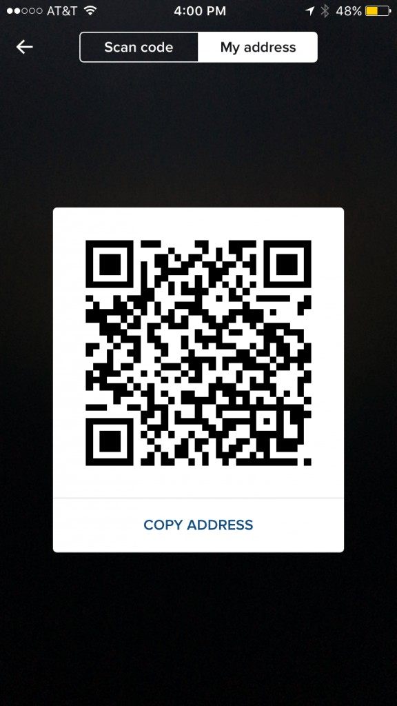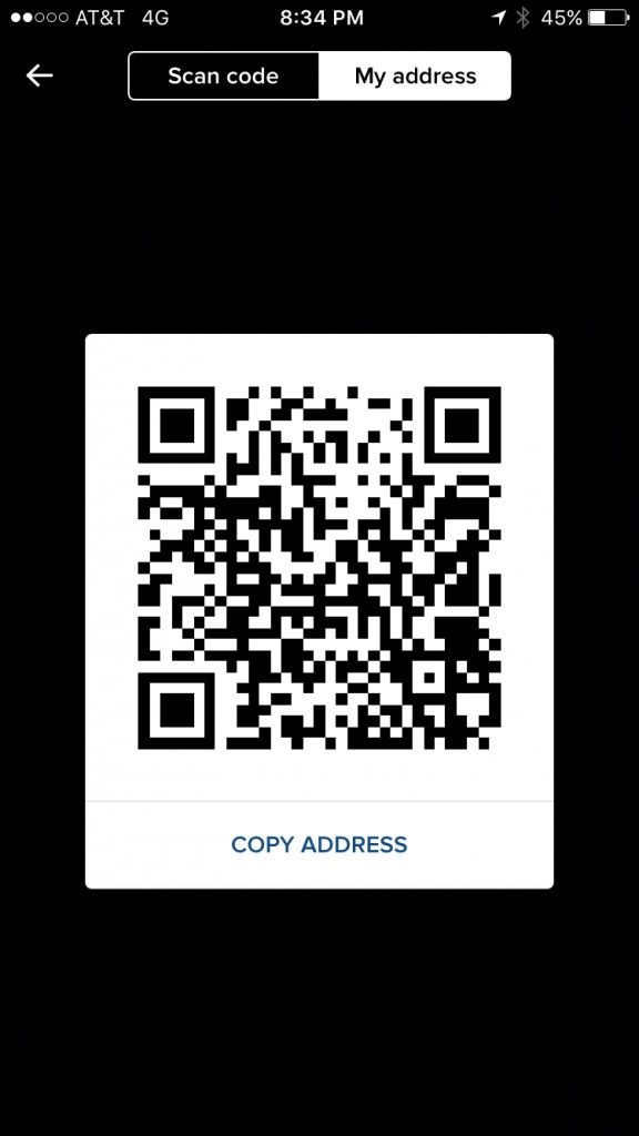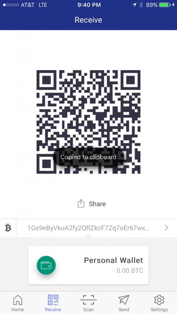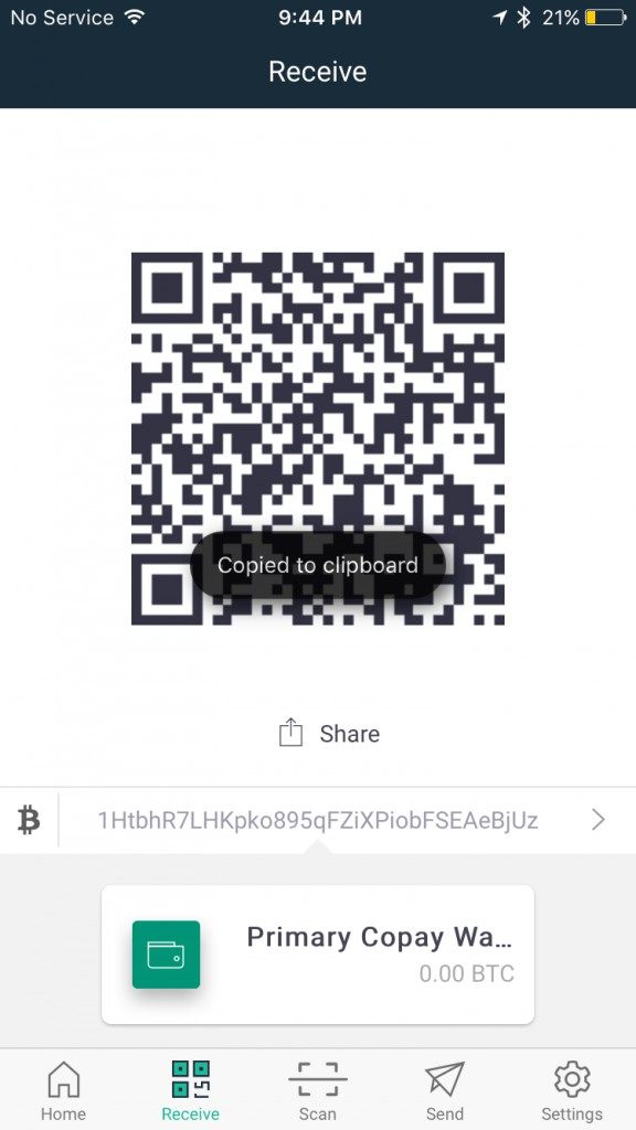 To share your address with the sender, follow the message on the screen, “Tap to copy this address” and share it with the sender via email or text”. A “Copied to clipboard” message will briefly flash below the QR code in place address.