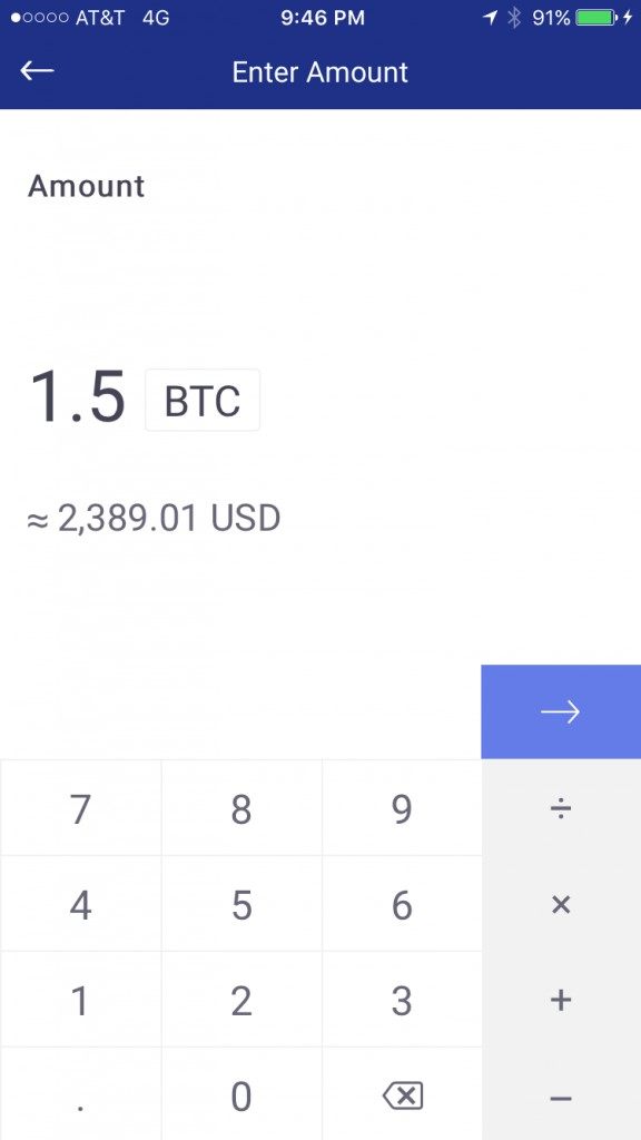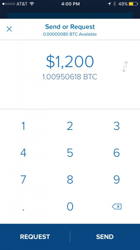 Next, enter the amount of bitcoins you want to send in the BTC or USD field and the current market value will display. Tap “Request” to send the payment request.