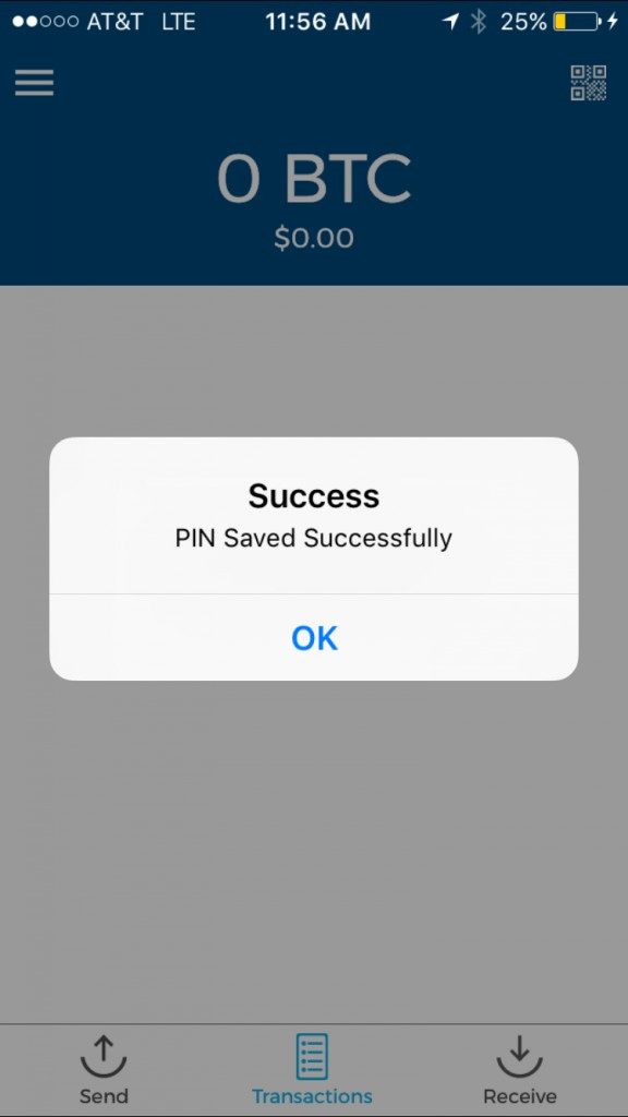 After you have successfully created your 4 digit PIN, Blockchain will display a “Success, PIN Saved Successfully” message. Your screen will look like the one below: