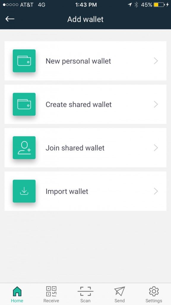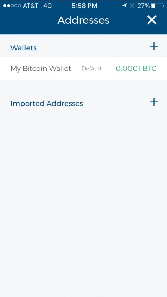 If you want to import bitcoins from another wallet, it’s easy to do. Just tap the stacked horizontal lines settings tab in the upper left hand corner and tap the “Addresses” option in the drop down menu.