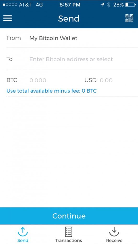 To send a payment, swipe left or tap the “Send” button in the bottom left hand corner of your screen and Blockchain will be take to the ‘Send’ screen like the one below: