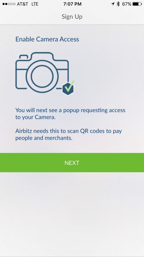 The step of the Sign Up process is enabling camera access for you Airbitz app.