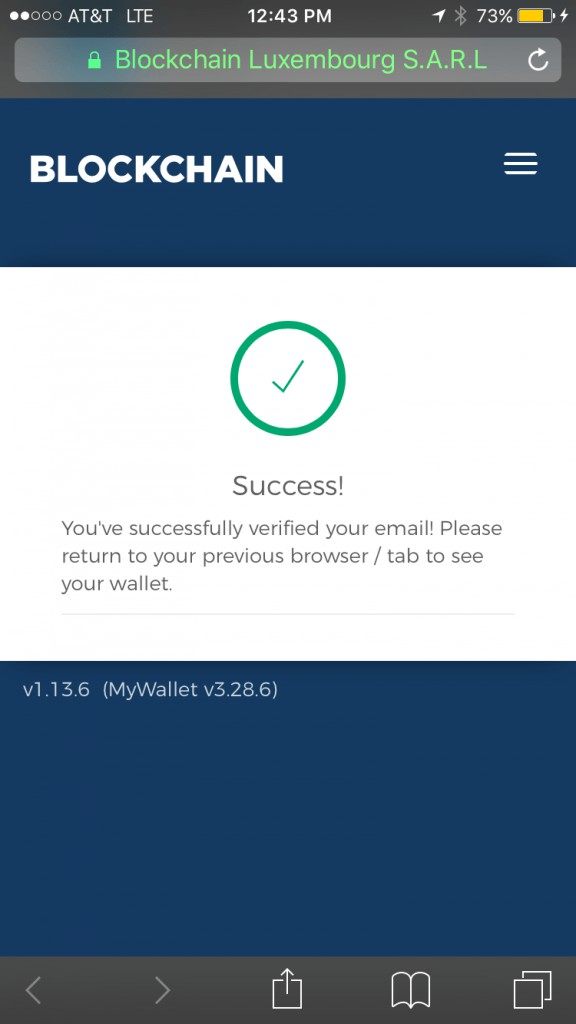 Once you verify your email, Blockchain will notify you by displaying a green check mark and circle followed by the “Success! You’ve successfully verified your email! Please return to your previous browser/tab to see your wallet” message.
