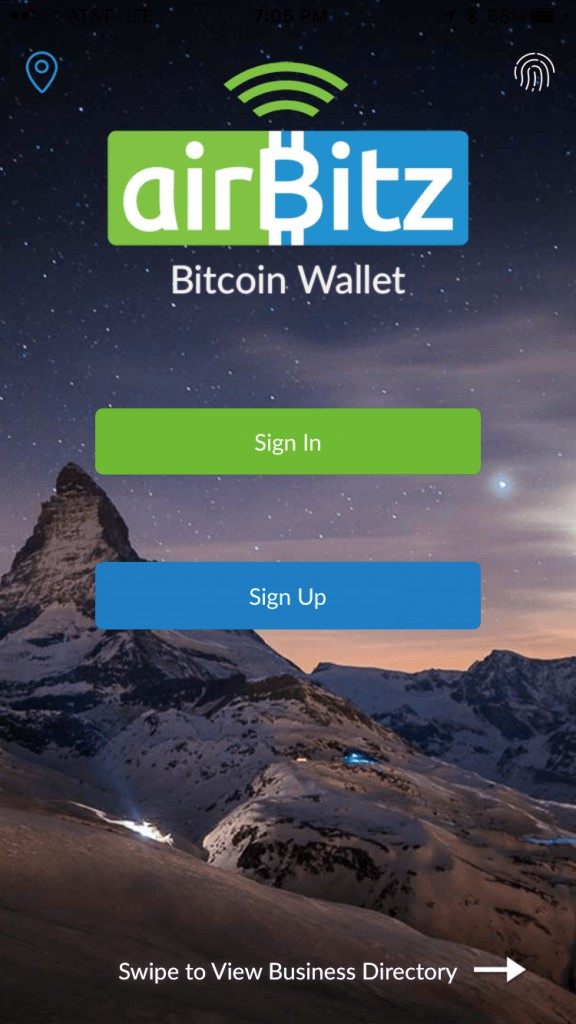 Airbitz provides users with multiple options on this page including signing up for Airbitz, sign into an existing account: