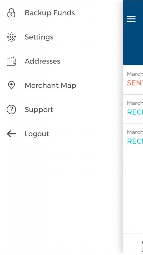 To backup your funds, tap the stacked horizontal lines in the upper left hand corner of your home screen. Choose the “Backup Funds” option on the drop down menu.
