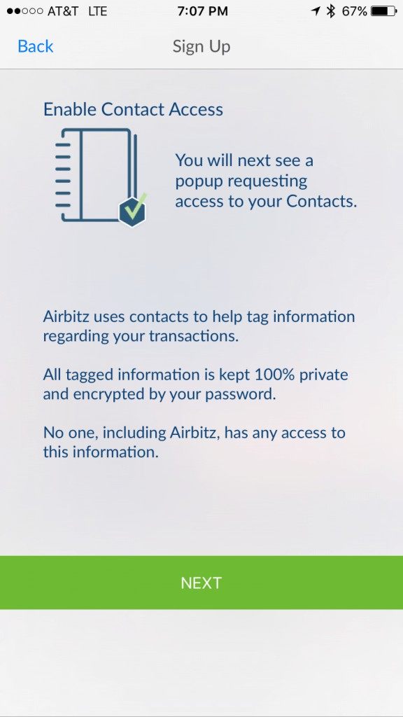 Airbitz uses contacts to help tag information regarding your transactions. All tagged information is kept 100% private and encrypted by your password.