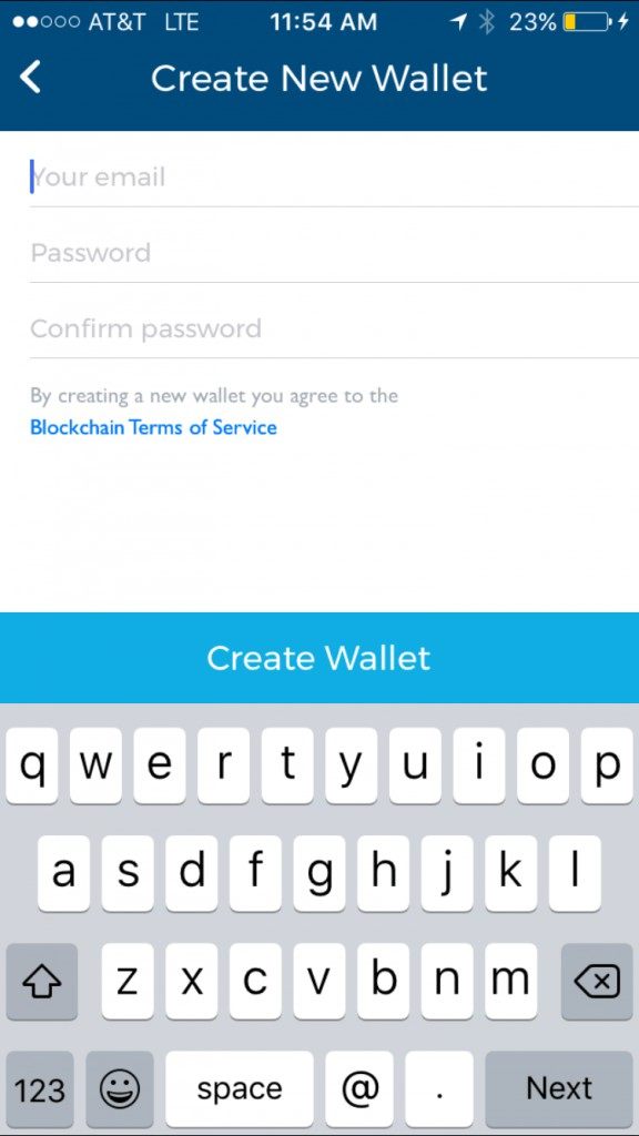 Next, Blockchain will ask you to enter your email, a password, and to confirm that chosen password by reentering it. Once you are done with this process, tap “CREATE WALLET”.
