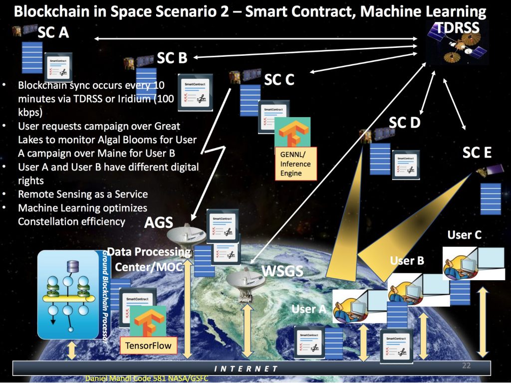 The blockchain technology and its advantages didn’t escape the attention of NASA and other space agencies, such as ESA, which considers its application in their own innovations of applications and architecture. Exploiting the blockchain technology has a huge potential in case of DSM (Distributed spacecraft mission), which can be imagined as “relaying” or coordinated joint mission among several spacecrafts. According to NASA, artificial intelligence (A.I.), together with the blockchain technology could be widely to create “space-based sensor networks” and its efficient management.
