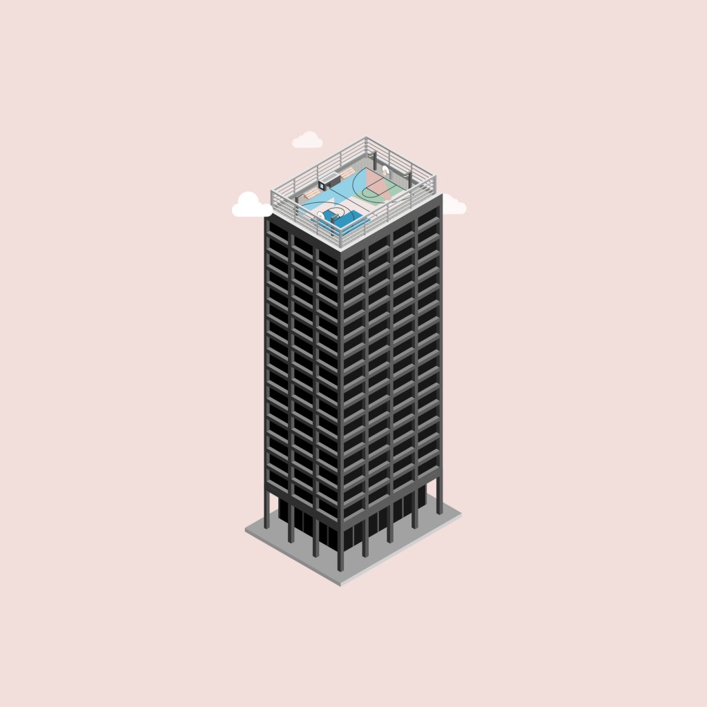This collection even features an insanely tall Helipad roof, a rooftop pool that goes edge-to-edge, and a group of roofs with giant emoji heads. Overall, the collection is more playful, city-oriented, and even pokes fun at the rigidity and blandness of everyday architecture.