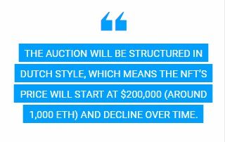 The auction will be structured in Dutch style, which means the NFT’s price will start at $200,000 (around 1,000 ETH) and decline over time.