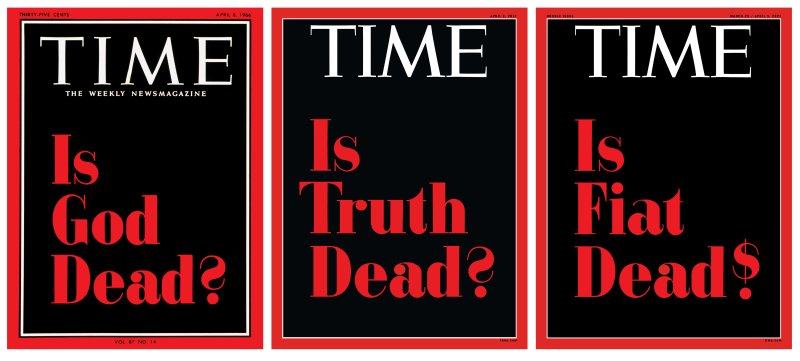 Inspired by the “Is God Dead?” cover from April 8, 1966, the original NFT rendition, released amid the stratospheric rise of NFTs and adoption of cryptocurrencies, returns to the stark black field and red bold typography to once again ask a topical question, “Is Fiat Dead?”