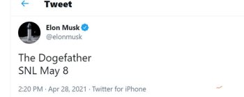 4月28日下午,#狗狗币大涨#再次登上微博热搜。当天,特斯拉CEO埃隆·马斯克(Elon Musk)再次发布了与狗狗币相关推文,并提到了他将于5月8日主持的《周六夜现场》SNL节目。